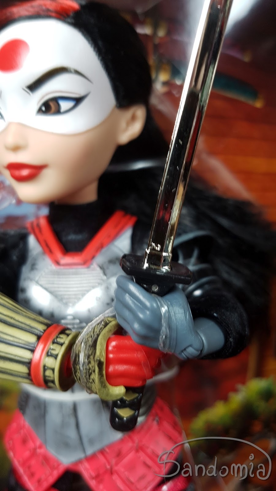Docelowy kartonik z lalką przedstawia dojo w którym siedzi Katana a za jej plecami widać zakradających się wrogów.
